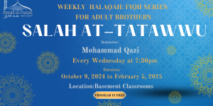 Announcements Weekly Fiqh Halaqah for Brothers A study of: Rawaatib, Qiyaam, Duha, Istikharah, Kusuf, Khusuf, Istisqaa, and much more! Instructor: Mohammad Qazi Time: Every Wednesday at 7:30pm Duration: October 9, 2024 to February 5, 2025 Location: …