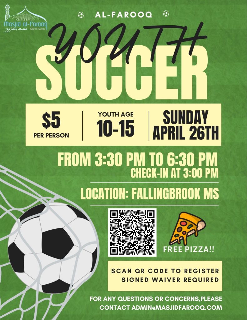 Welcome to the Al-Farooq Youth Soccer! Join us for a fun-filled day of soccer at Fallingbrook Middle School. Lace up your shoes, grab your friends, and get ready to show off your skills. Whether you’re a seasoned pro or just looking to have some fun, this event is perfect for all soccer enthusiasts. Don’t miss out on the excitement – mark your calendars and come kick it with us!